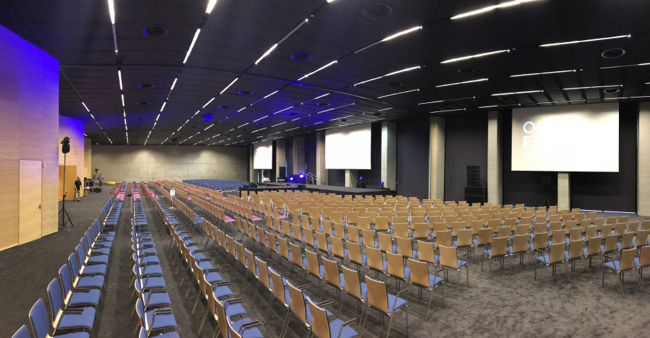 The rectangular room, 18 x 66 m with a surface area of 1188 m², can accommodate various types of events. It is furnished with chairs and conference tables and the arrangement can be adapted to any event.